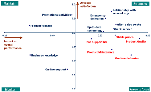 Correlation analysis is typically used for Customer Satisfaction & Employee Satisfaction studies to answer questions such as “which elements contribute most to someone’s overall satisfaction or loyalty?” This can lead to a “derived importance versus satisfaction” map. See below.