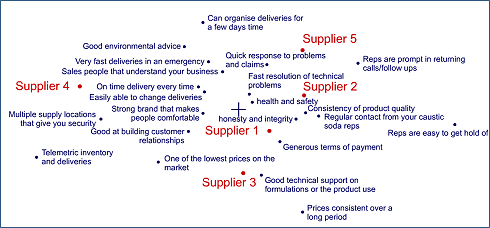 The centre of the map (the cross on the map), represents the overall mean of each attribute, and is the centre around which the brands are dispersed. The more a brand tends to lie in a similar direction away from the centre as an attribute, the more a brand is associated with that attribute. This also means that brands and attributes near the centre of the maps are not differentiating. The length of an attribute vector represents the extent to which the brands differ on that attribute.