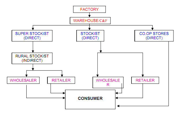 Main Godown -> C&F Agents/Super Stockists -> Distributors as per the territories -> Wholesalers/Retailers