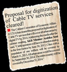 The Government of India (GOI) has passed a mandate that all cable services in the four metros be digitized by 30th June, 2012. From 30th June, the four metro cities will cease to receive analogue television broadcast signals. The target for complete digitization in urban areas is September 31, 2014 while the entire country is expected to achieve digitization by December 31, 2014.