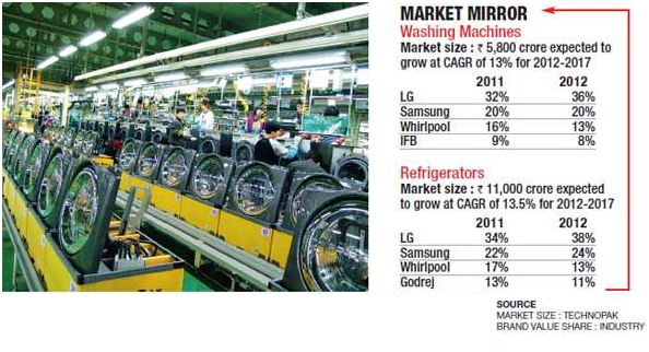 LG is currently the market leader in both washing machines and refrigerators as per Gfk-Nielsen. For 2012-13, LG is targeting a turnover of Rs. 5000 crore in refrigerator segment. LG will launch flagship products across the home appliances category which will help in strengthening its product leadership.