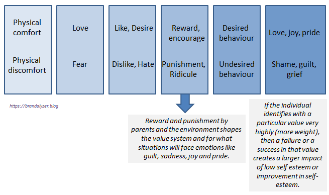 All individuals start as infants with craving for physical comfort and hate for physical disomfort, and therefore developing emotions for people or items that provide those physical comfort and discomfort. In parallel with this behavior, they are also treated with reward and punishment in some form driving them towards what is a desired and undesired behavior in that context of living. Slowly, these ways of life become the values of the individual culturally and emotionally leading to established individual-wide emotions such as pride, joy, shame and guilt depending on which way the individual was driven largely.