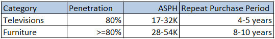 With all the technology changes and size changes and brand changes that happen at rapid pace in the television industry, it is fair to assume that an average household might change their television every 4-5 years (the actual number a few years ago in 2016 was 5 years). This means an average household is repeat purchasing the furniture every 8 to 10 years. This is a pretty long period of repeat purchase for any category.