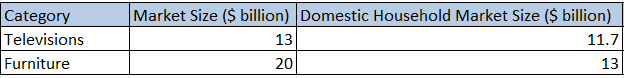 Out of the $20 billion market of Furniture, domestic household consumption contributes to about $13 billion (65%) and institutional businesses (majorly office, hotels and education institutions) contributes to the remaining $7 billion (35%). This means the television market size is almost equal to the domestic furniture market size. But, for the time being, let’s ignore and assume the market sizes of Furniture as $20 billion and TV as $13 billion, and come back to this difference at the end of this article.
